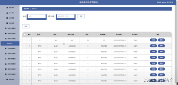 会员用户管理模块的实现涉及到会员用户的注册、登录、信息查看和编辑、健身课程管理、健身卡管理以及账号权限管理等功能。通过使用Java语言和相关技术,可以实现这些功能,并提供一个高效、便捷的会员用户管理系统。会员用户管理界面如图5-4所示。