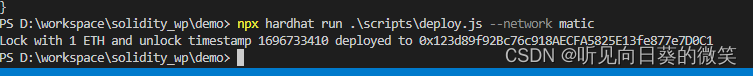 准备工作已经完成,接下来,让我们进入真正的验证合约流程,首先,我们先在matic测试网创建一个合约,还是使用Lock.sol这个合约来创建(如何部署合约,可以看上一篇教程[发布合约]),执行命令: