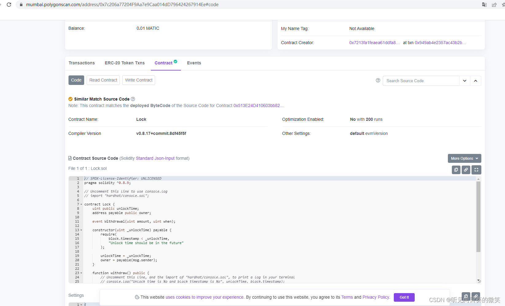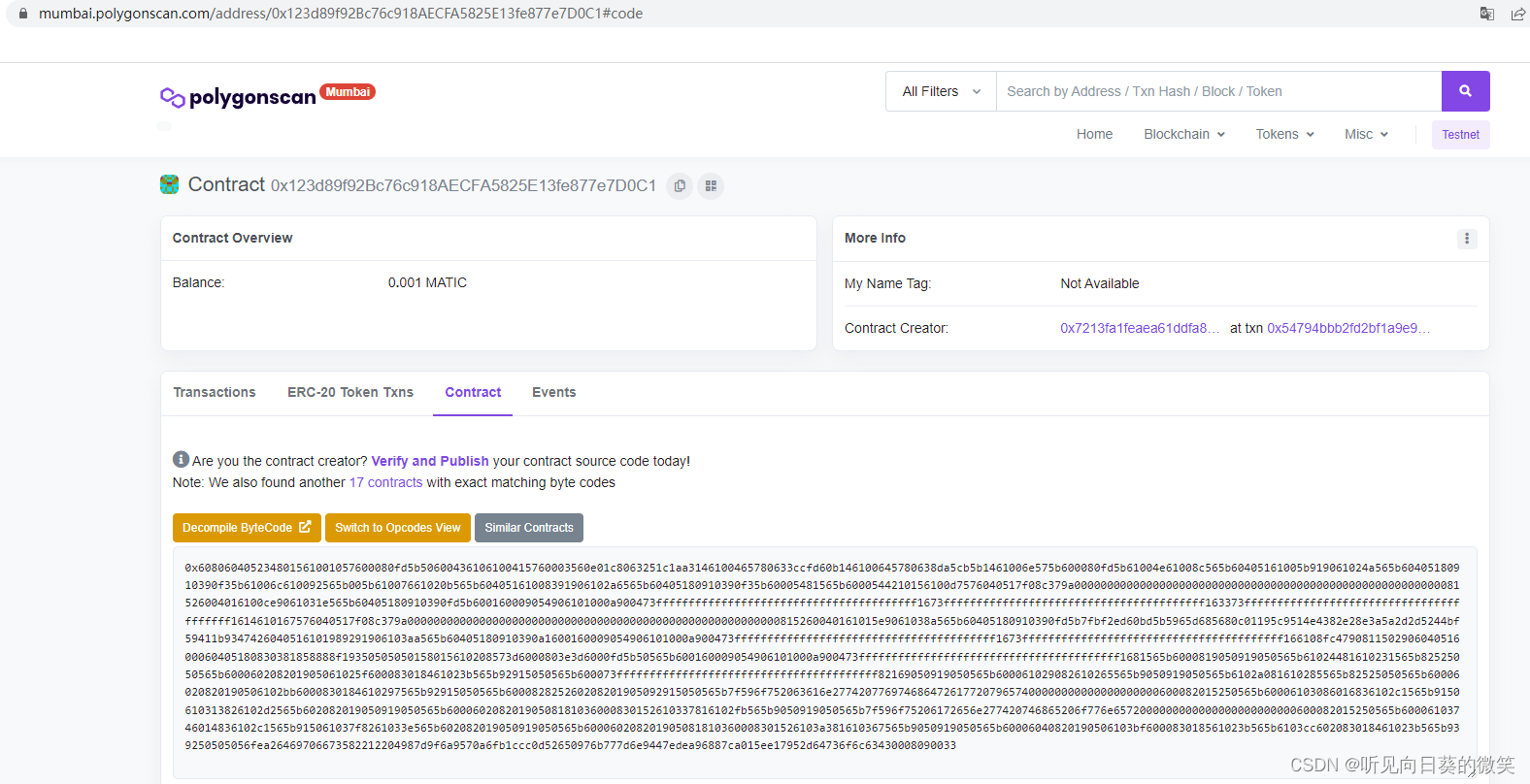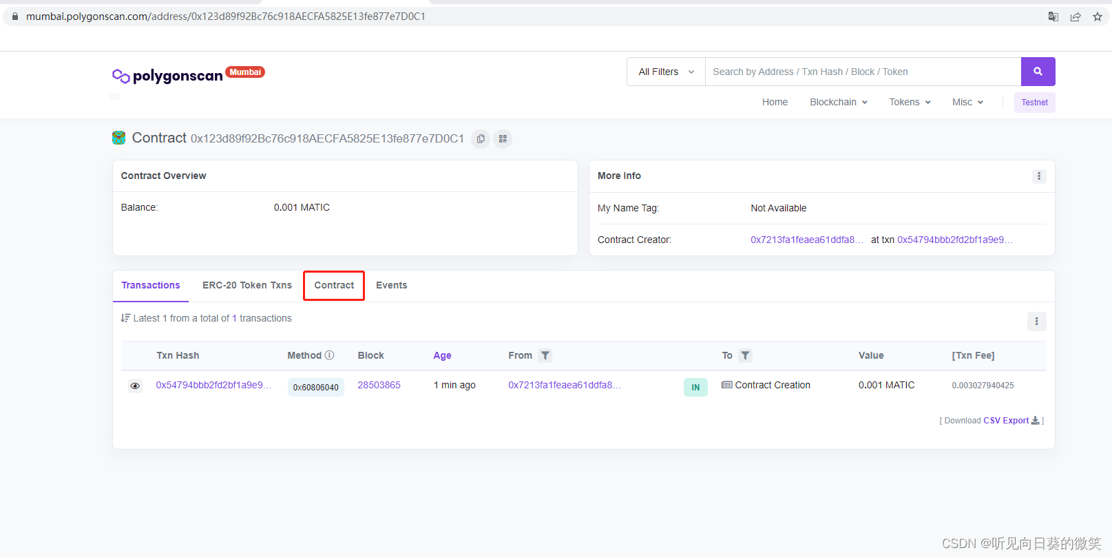 我们复制这个合约地址,访问matic的测试区块链浏览器看一看它的详情