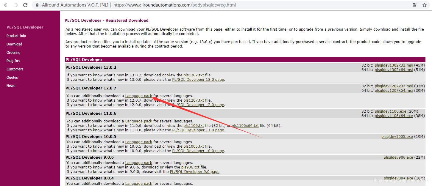 2、找到自己电脑安装的PL/SQL版本、点[Language pack]
