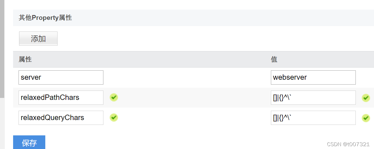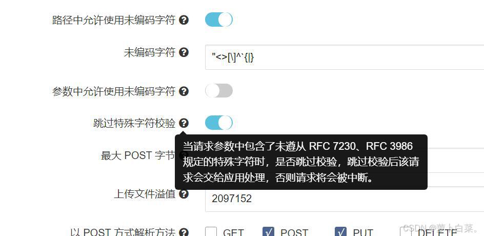 | relaxedQueryChars | URI query 允许的特殊字符,可设置值为[]|{}^\` |