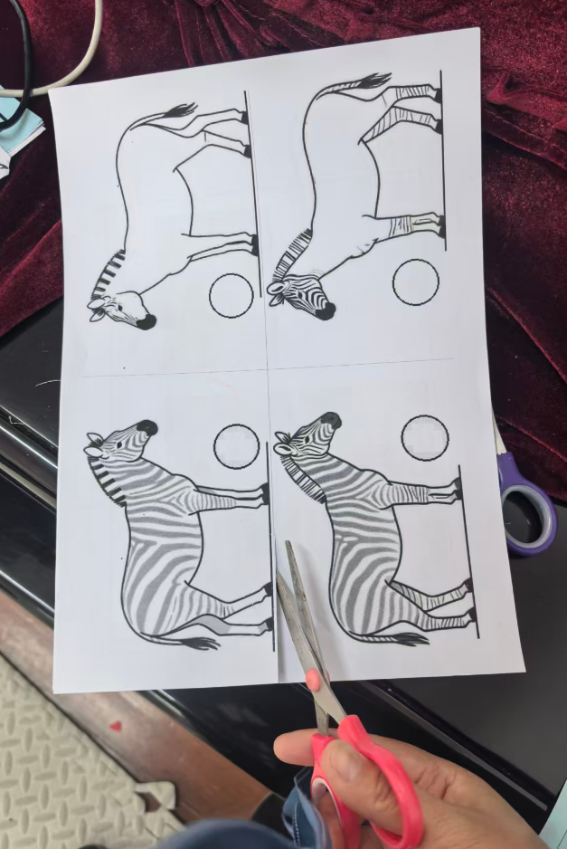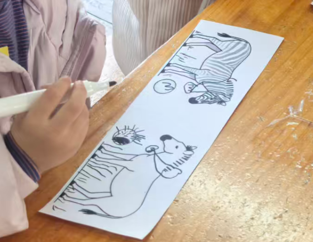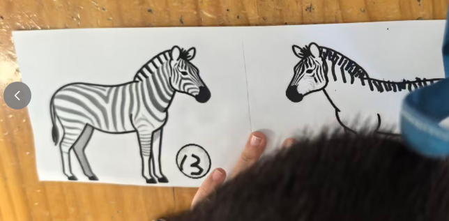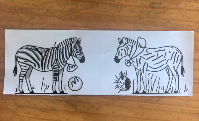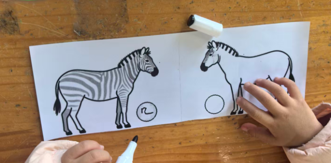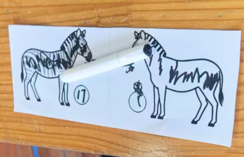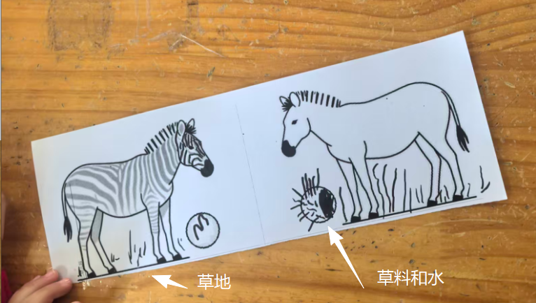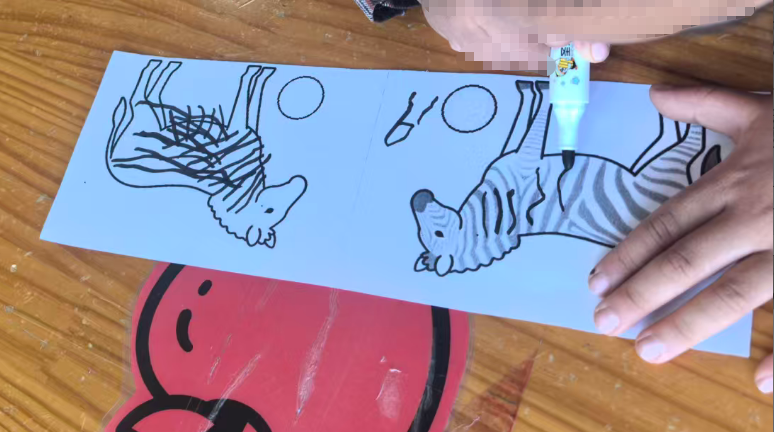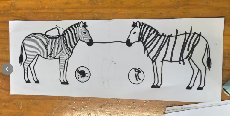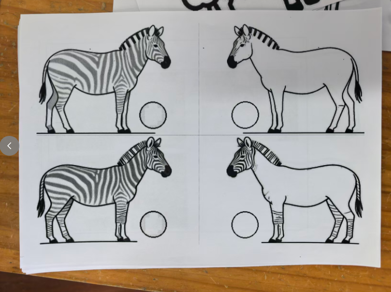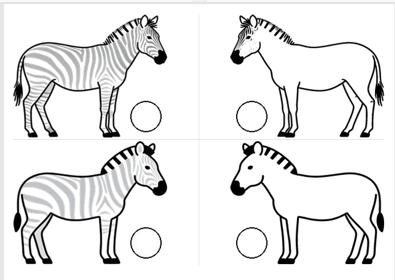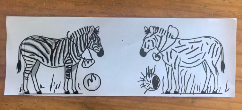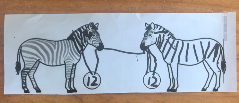 斑马可以在单元格的左中右,昨天做的斑点狗是左图居右,右图居左,两只狗在互相“嗅气味”。基于原图尺寸,所有打印纸的左右两侧有很多的空白