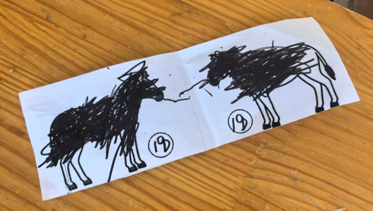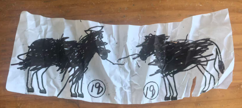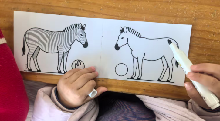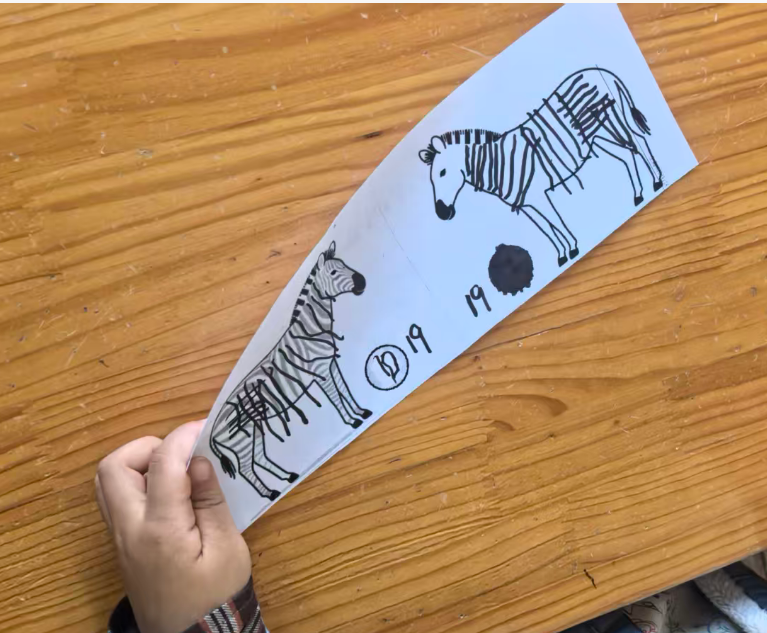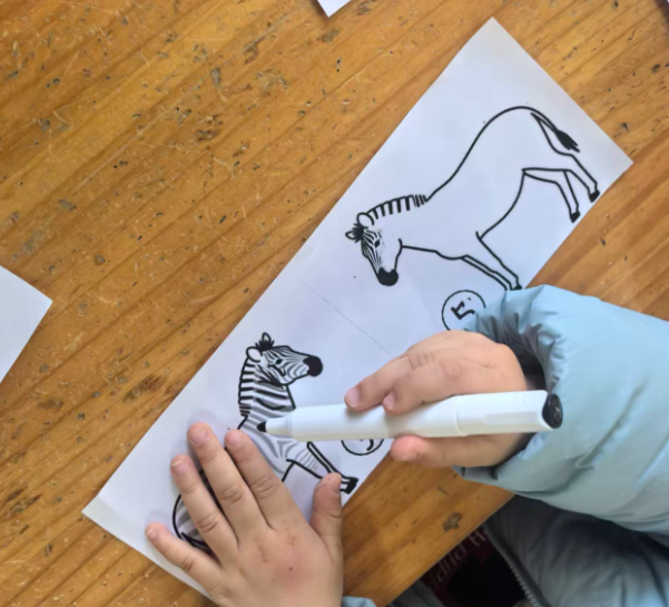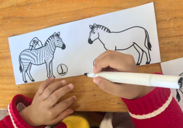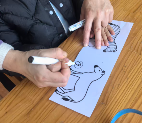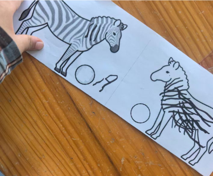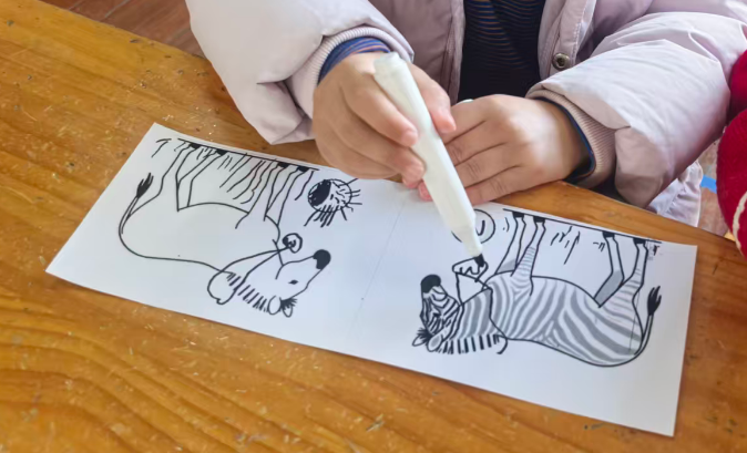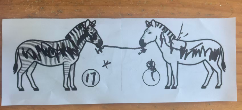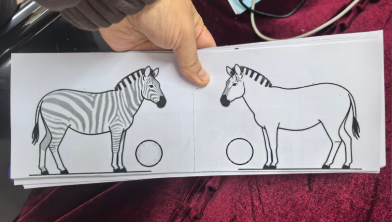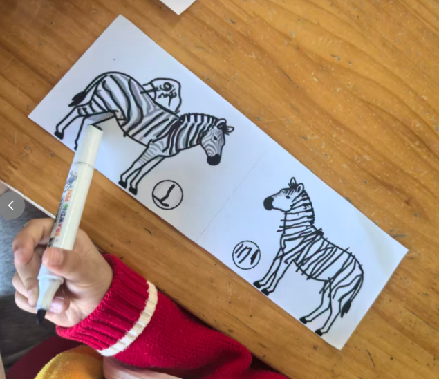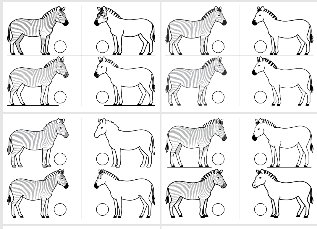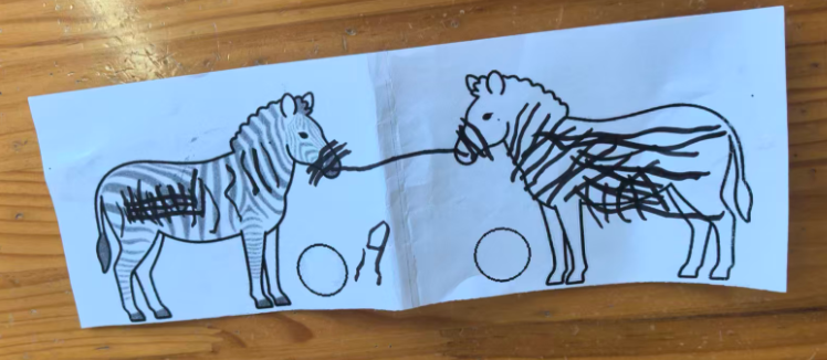 斑马可以在单元格的左中右,昨天做的斑点狗是左图居右,右图居左,两只狗在互相“嗅气味”。基于原图尺寸,所有打印纸的左右两侧有很多的空白