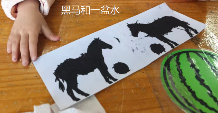 我想了想,还是用分开(左图居左、右图居右)的方法,让中间的空隙里可以写文字,好像两匹马在说话(小朋友让我写下自己给斑点狗取的名字),圆圈里可以放线条(草)
