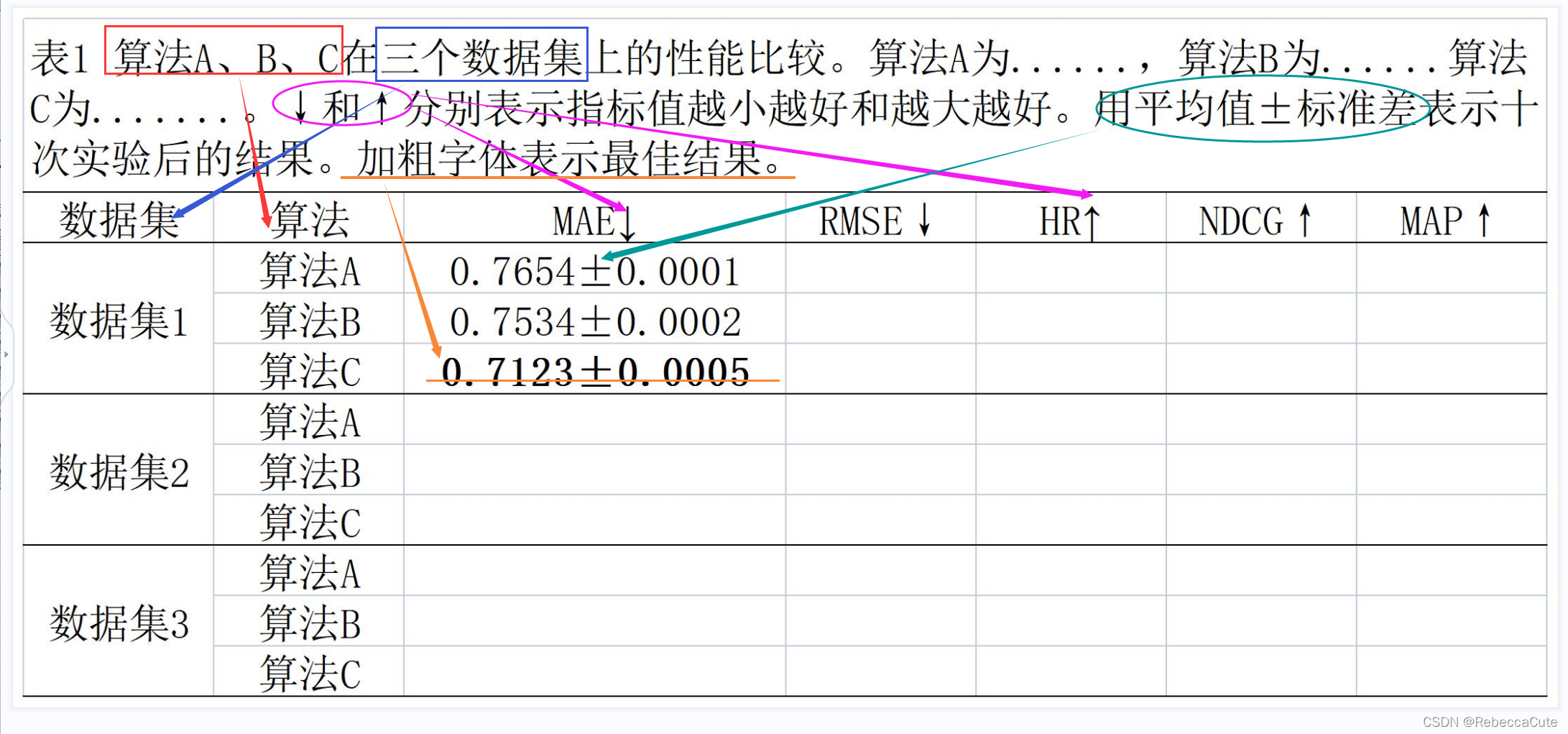 描述箭头和±后,由于在推荐系统中,大家对MAE、RMSE、HR、NDCG、MAP指标很熟悉,故没有在描述表格时赘述。