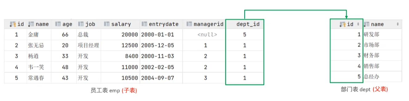 注意:目前上述的两张表,在数据库层面,并未建立外键关联,所以是无法保证数据的一致性和完整性的
