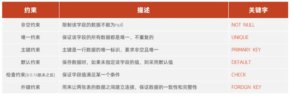 - 约束是作用于表中字段上的规则,用于限制存储在表中的数据