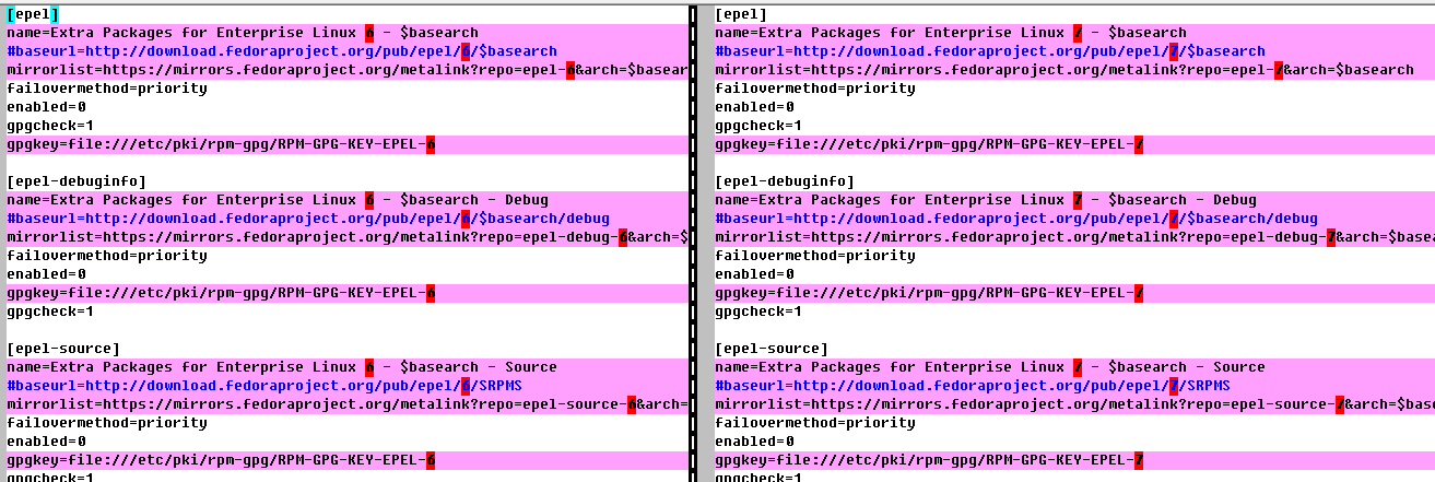通过对centos6和centos7的epel.repo文件对比可以知道两个操作系统引用rpm包的不同位置,需要单独配置