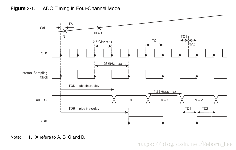 从上图我们还可以得知,外部2.5GHz的时钟为该ADC芯片提供时钟源,进入内部时钟电路(Clock Circuit),内部时钟电路相当于一个二分频的作用,产生1.25GHz的时钟信号分别输入四个通道,为其提供时钟信号。