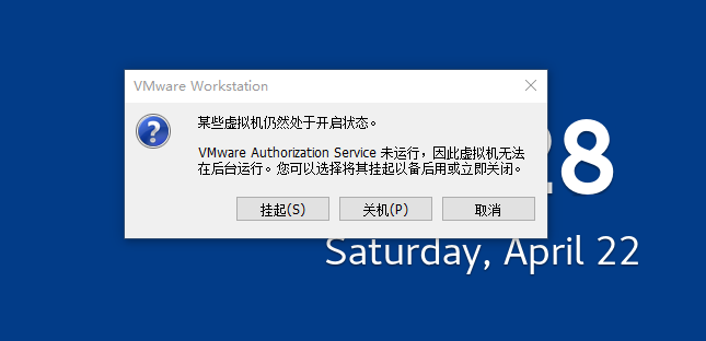 使用VMWare创建虚拟机后,通过其他ssh工具连接即可,此时为了节省资源,希望VMWare虚拟机后台运行,将VMWare客户端关闭,点击关闭后,发现没有后台运行选项了,如下图所示