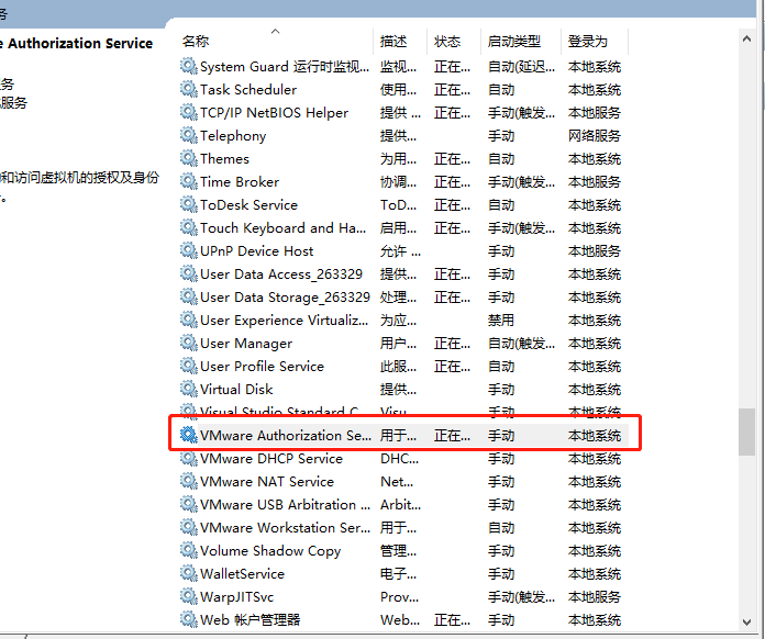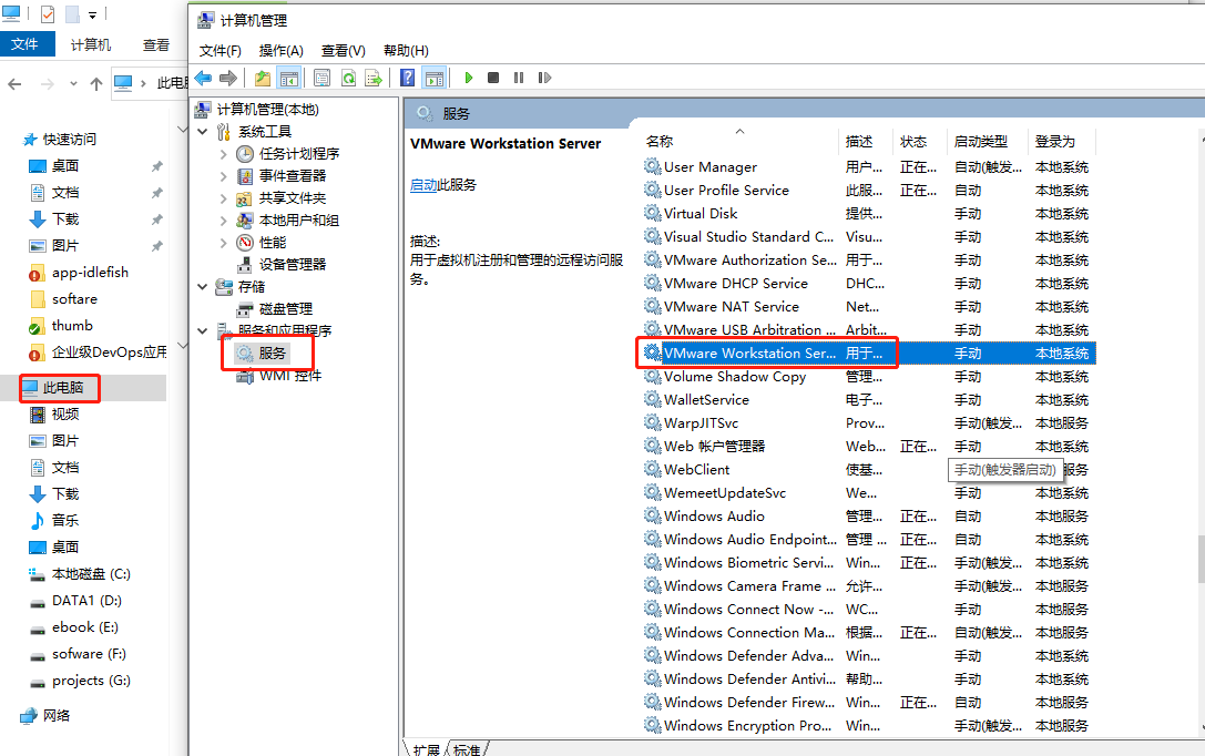 (1)在【此电脑】上右键-【管理】,打开计算机管理界面,然后找到【服务】,再在右边的服务列表中找到VMware Authorization Service 服务,如下图所示