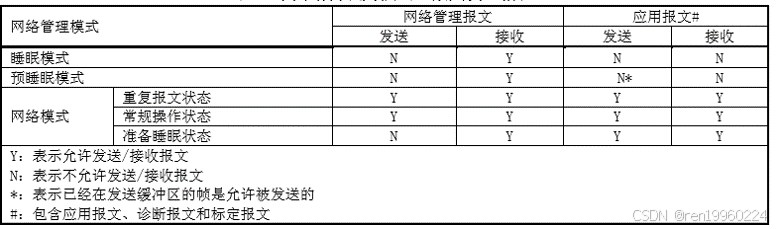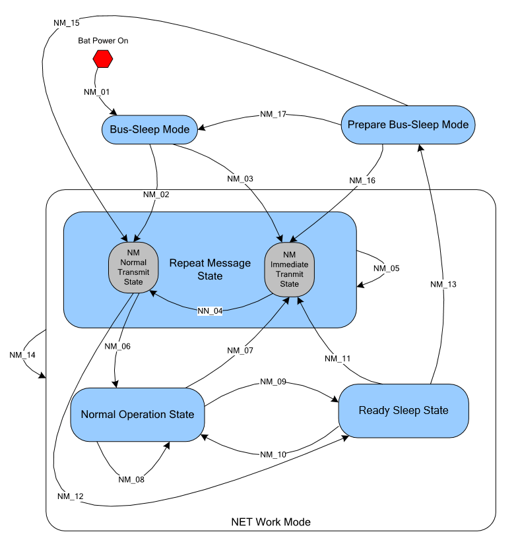 睡眠模式(Bus-Sleep Mode):当节点没有本地网络唤醒以及远程唤醒请求时,ECU通讯控制器切换至睡眠模式,ECU功耗降低至适当水平;此模式下,NM报文只收不发,APP报文不收不发,当出现有效唤醒源时必须要被唤醒;