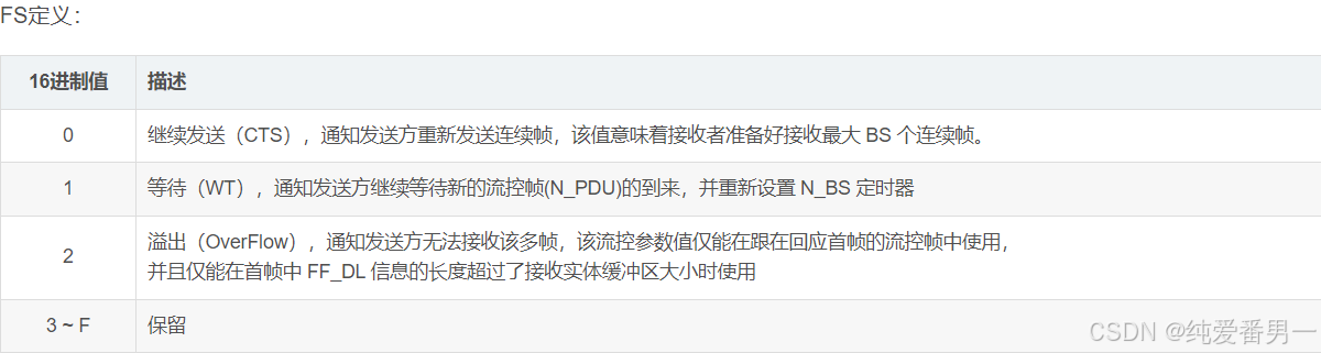 接收端接收到首帧后,发送流控帧给接收端,告知发送端自己在发送下一帧流控帧之前能够接收最大数量的连续帧,以及两个连续帧之间的间隔,发送端接收到流控帧的要求后,按照该要求继续发送连续帧。接收端不断接收连续帧,若接收端已经收满BS数量的连续帧,且与首帧中包含的数据长度对比发现数据还没接收满,则会继续发送流控帧,发送端会接着发送连续帧,以此类推,直至所有数据发送完成。
