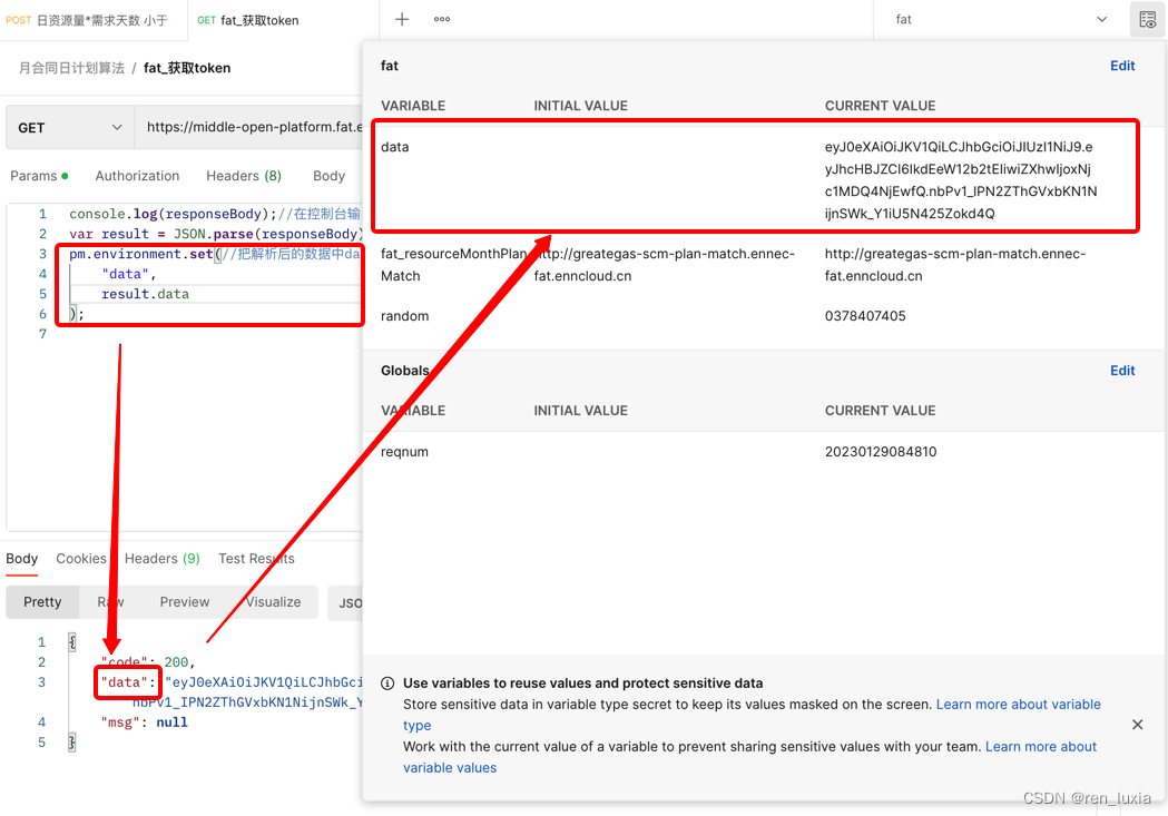 pm.enviroment.set("data",result.data); //将解析后的data数据,赋值给设置的data变量