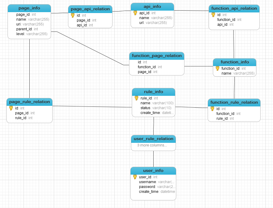 1、权限控制功能,其核心思路是控制某“用户”所属“角色”可以访问哪些“角色”,可以访问哪些“功能”。在前后端分离架构模式下,功能实现是基于“接口”进行的,所以“功能”和“页面”会分别和“接口”所关联。2、所以数据库中,至少有以上5张表,分别为:用户信息表、角色表、页面信息表,接口信息表,功能信息表,并且分别建立彼此之间的关联表创建表结构sql语句如下:CREATE TABLE `api_info` ( `api_id` int(11) NOT NULL, ...