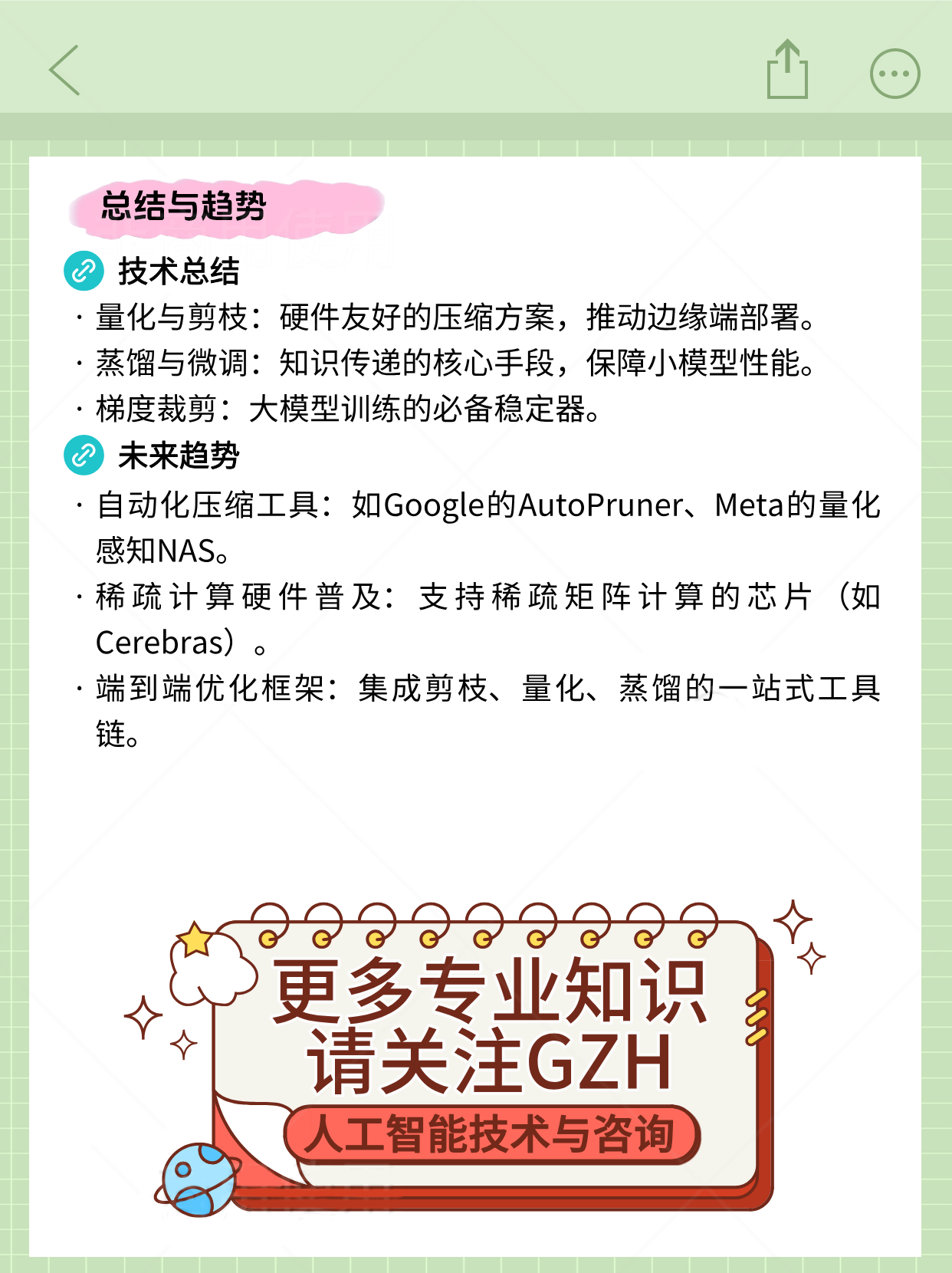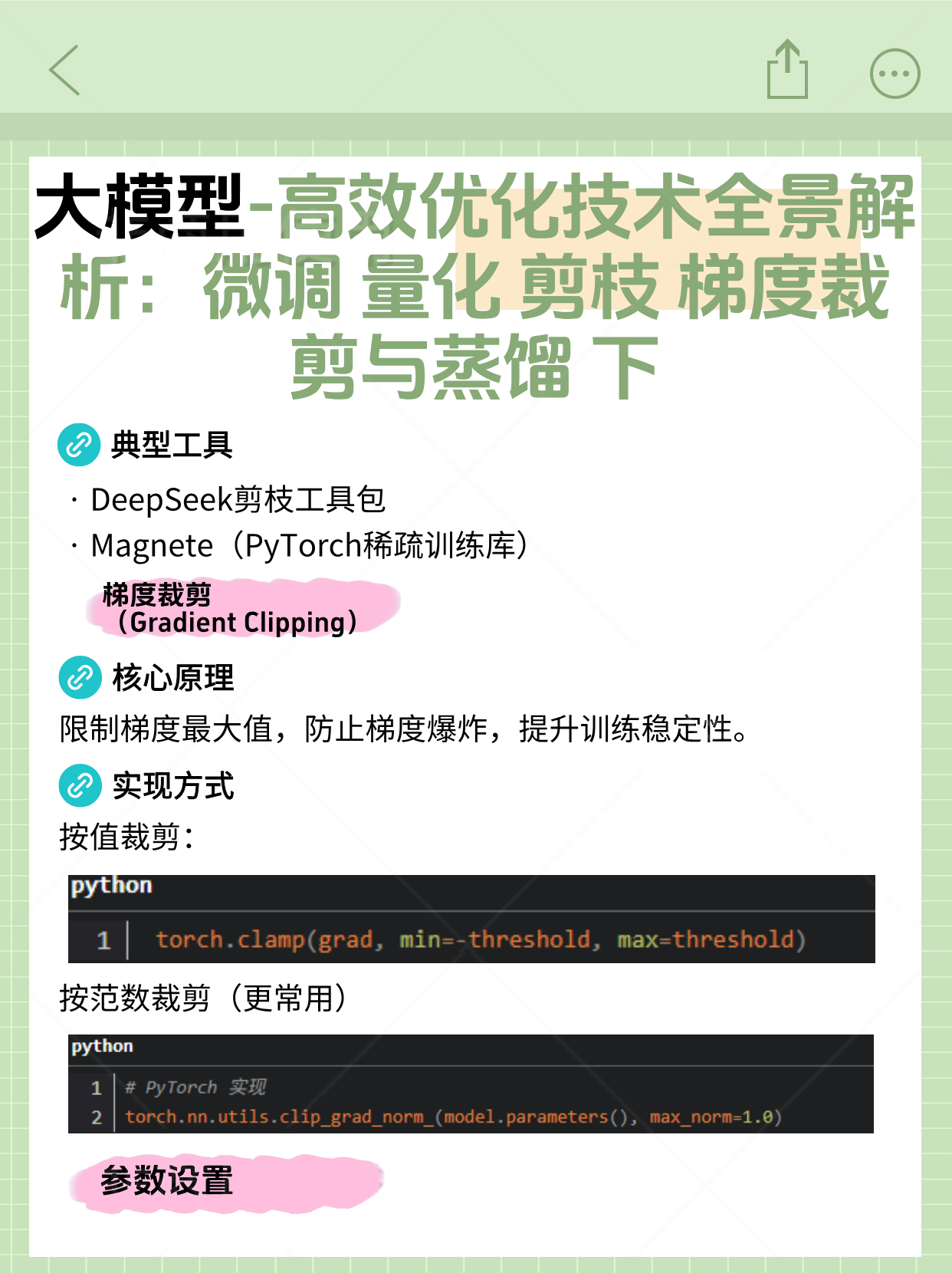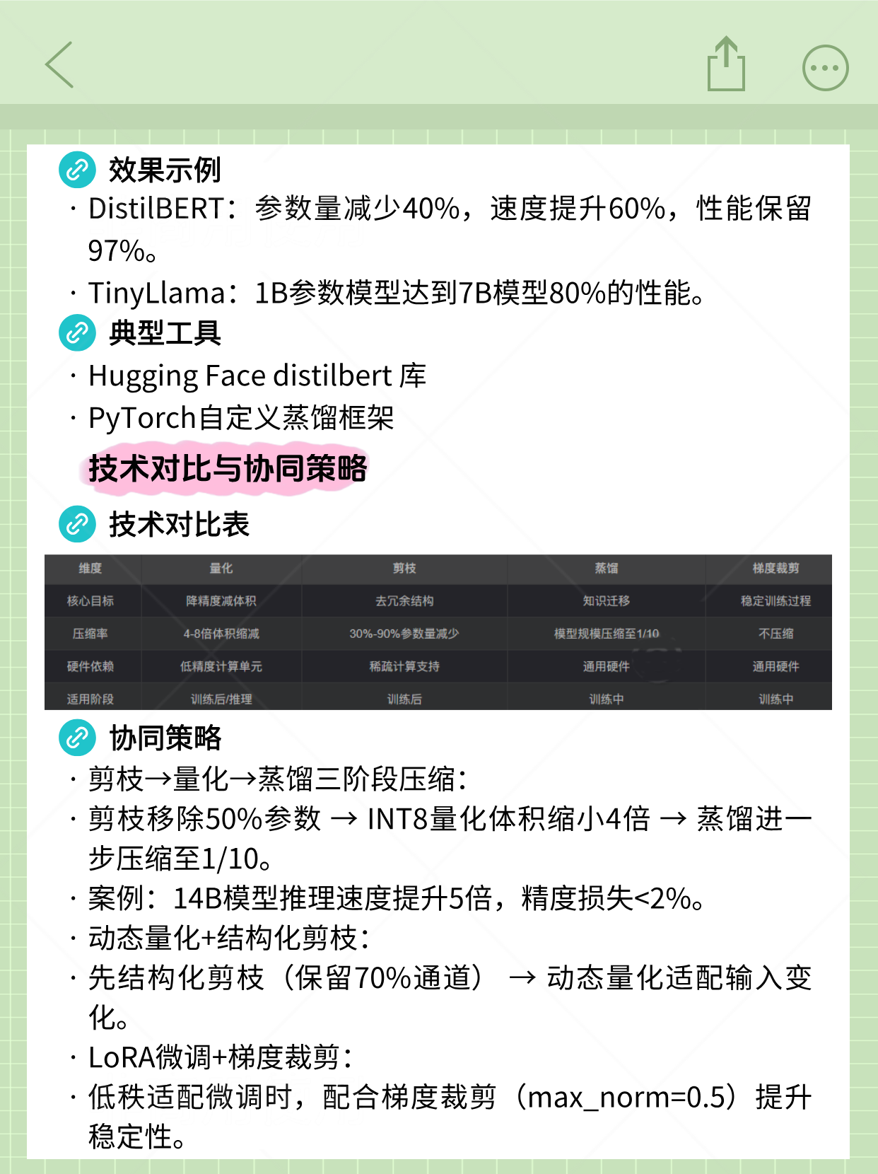 微调(Fine-tuning) 量化(Quantization) 剪枝(Pruning) 梯度裁剪(Gradient Clipping) 知识蒸馏(Knowledge Distillation) 技术对比与协同策略 七、总结与趋势