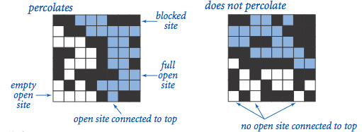 有一个四方的模型,由 N*N 个区域(site)组成,每个区域有两个状态,开启(open)或关闭(blocked),相邻的开启区域能构成一条通路,当最上层区域能够通过开启区域连成的通路,和最下层互通的时候,则整个模型为渗透状态(percolated)。