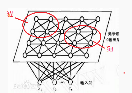 SOM自组织神经网络是两层结构,包括输入层和竞争层。为什么要用这种结构?因为Kohonen根据生理学的发现,认为神经网络在接受外界输入时,将会分成不同的区域,不同的区域对不同的模式具有不同的响应特征。如下图,人对猫和狗的概念储存在不同区域。