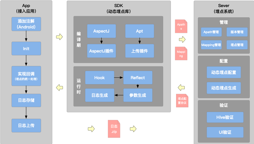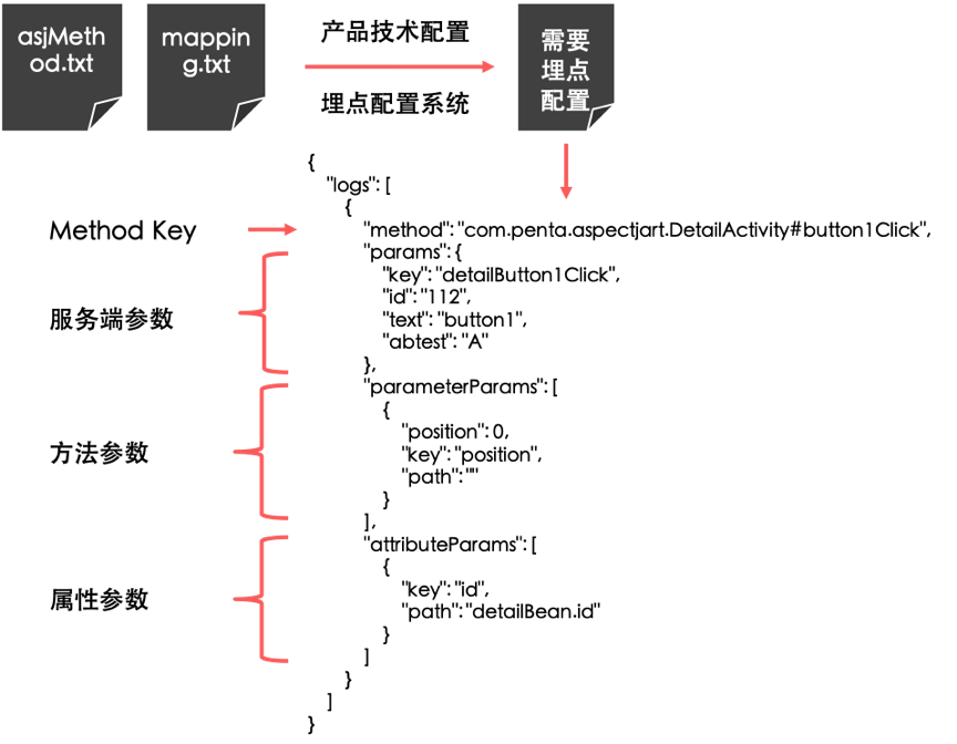 运行时,当方法被调用时,检测内存中Key有没有该方法如果有则通过反射获取对应参数合并服务端参数生成日志上传。