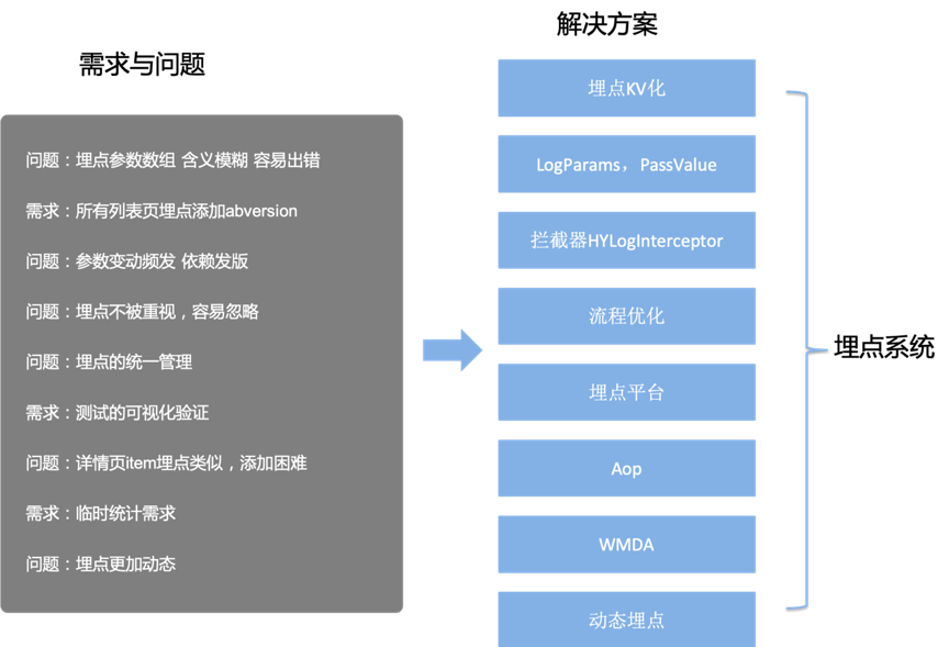 埋点日志的统计,数据的分析,直接影响产品方向和运营决策。对于黄页类产品,由于本身种类繁多,埋点体量大,在实际的开发和统计过程中遇到了很多问题,本文所探讨的埋点治理方案基于实际场景的需求所提出的,具有一定的实践意义,以下是例举的实际场景下的需求与对应解决方案,如下图所示: