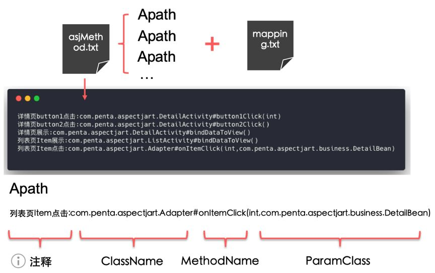 开发时在对应需要埋点或可能需要统计的地方添加注解,编译期通AspectJ插入埋点代码,并通过上传插件上传可埋点方法文件,何Mapping文件,可埋点方法文件如下图所示是由一个个Apath组成。
