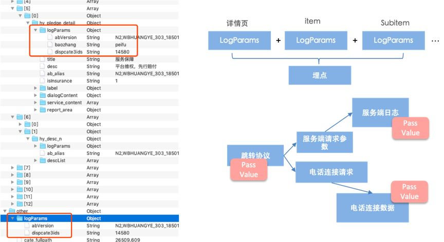 item级别logParam等等,逐层嵌套覆盖,生成最终实际的埋点参数,实现埋点参数的动态化。PassValue主要使用透传,跟随跳转协议,用于服务端日志,电话连接请求与参数,实现请求参数的动态化。