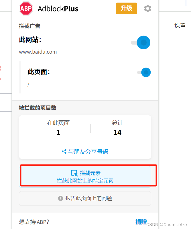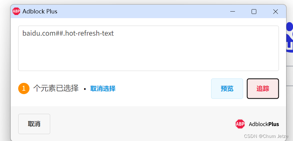 下载Adblock plus :https://chromewebstore.google.com/detail/adblock-plus-%E5%85%8D%E8%B4%B9%E7%9A%84%E5%B9%BF%E5%91%8A%E6%8B%A6%E6%88%AA%E5%99%A8/cfhdojbkjhnklbpkdaibdccddilifddb,自动安装到谷歌浏览器后,打开百度页面,直接单击Adblock插件,选择拦截元素,选择页面需要拦截的内容,会生成对应的元素规则,复制后,打开Adblock的选项,到过滤列表中添加即可。
