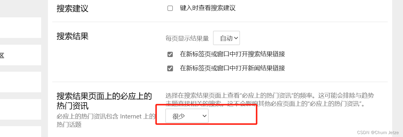 bing搜索页设置-更多-搜索结果页面上的必应上的热门资讯,选择很少。