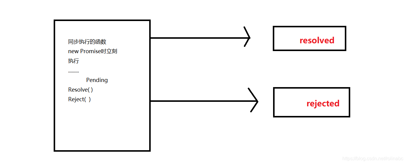 Promise一旦新建就立刻执行, 此时的状态是Pending(进行中),它接受两个参数分别是resolve和reject.它们是两个函数.