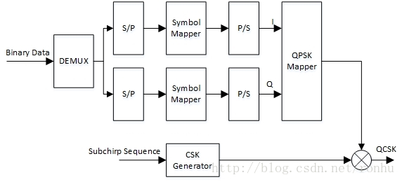 信号调制的最后一步是进行Chirp扩频,也即进行QPSK到QCSK的调制。在802.15.4a中,一个Chirp符号(Chirp Symbol)由4个Chirp脉冲(subchirp)构成,每个subchirp调制一个上述的QPSK码。从而一个Chirp符号可以编码4个QPSK码字。