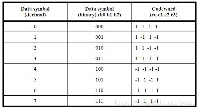 但这样生成的符号流并不直接用于传输,而是进行一次数据符号(data symbol)到双正交码字(bi-orthogonal codeword)的变换。采用双正交码字可以减少互相干扰和多径效应的影响,在802.15.4a中为数据速率1Mb/s的传输定义了以下的符号转化表。