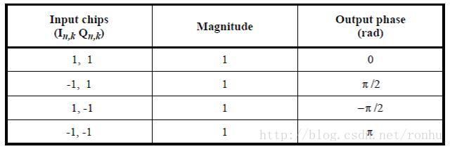 然后,进行P/S变换,将生成的I、Q流结合在一起,生成作为QPSK编码输入的码片序列(chip sequence)。上例中的I、Q流结合生成IQ信号,为:1 - j,-1 – j,1+ j,-1 + j。