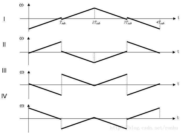 在802.15.4a中定义了4种Chirp符号,占用两个相邻的子频带,频率随时间的变化如下图所示: