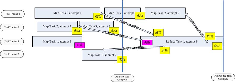 首先,是一个时序图。它模拟了一 个由3个Map任务和1个Reduce任务构成的作业执行流程。我们可以看到,在执行的过程中,只要有人太慢, 或者失败,就会增加一次尝试,以此换取最快的执行总时间。一旦所有Map任务完成,Reduce开始运作(其实,不一定要这样的...),对于每一个 Map任务来说,只有执行到Reduce任务把它上面的数据下载完成,才算成功,否则,都是失败,需要重新进行尝试。。。