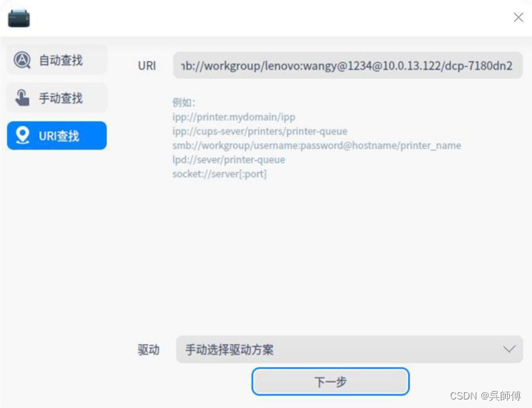 1、在自动查找和手动查找的情况下都不能查询到打印机时,可通过URI查找并安装打印驱动。