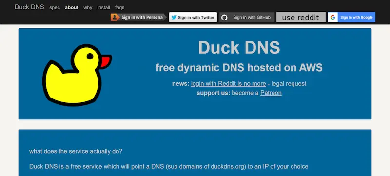 一个免费的动态域名服务,允许用户注册 duckdns.org 的子域名,并且随时更新所指向的 IP 地址。