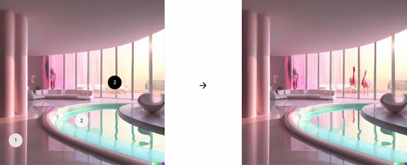 它可以根据文字描述,生成逼真的图片,比以前任何实现的效果都好,上图就是"骑马的宇航员"的生成结果。它还可以对现有图片进行修改,下图是"在3号位置添加两只火烈鸟"。