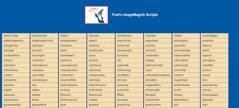 这个网站将图像处理工具 ImageMagick 的常用操作,封装成脚本,方便下载使用,一共有200多个脚本。