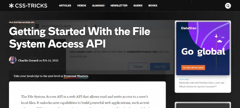 浏览器现在提供了文件访问 API(File System Access API),允许网页 JS 脚本读写本地文件,本文是一个详细的介绍。另外,也可以参考 Webkit 官网对这个 API 的介绍。