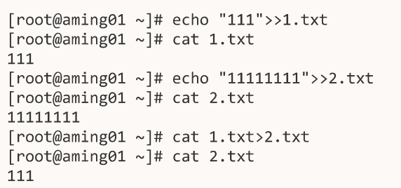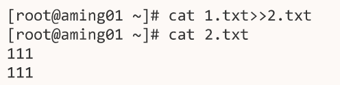 cat 1.txt>> 2.txt,两个大于号>>表示追加,不会删除2.txt的内容,将1.txt的内容追加到2.txt里面去