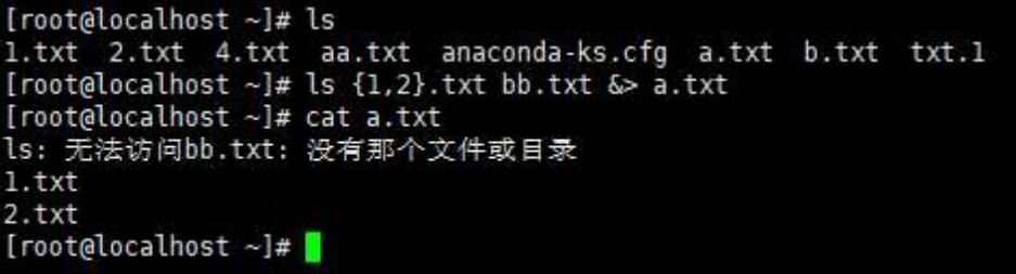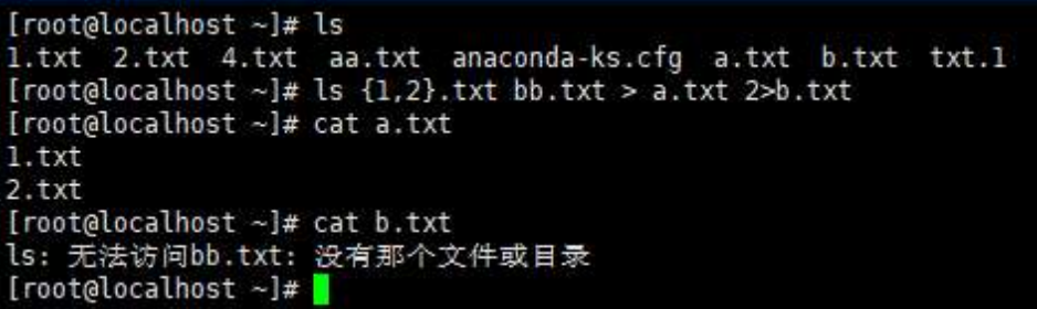 ls {1,2}.txt bb.txt > a.txt 2>b.txt;表示将正确的输出信息都输入到a.txt中;错误的输出信息都输入到b.txt中