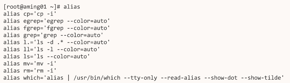 我们可以通过alias把一个常用且很长的指令另取名一个简单易记的指令,如果不想用了,也可以使用unalias取消别名,直接执行alias命令,则会看到系统中所有的别名