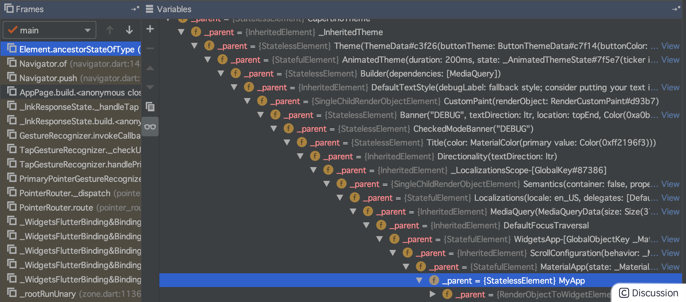 在讲解Element的ancestorStateOfType方法前,我们要知道Widget和Element的对应关系,可以参考一下这篇文章 Flutter之Widget层级介绍。在这里可以简单的认为每一个Widget对应一个Element。