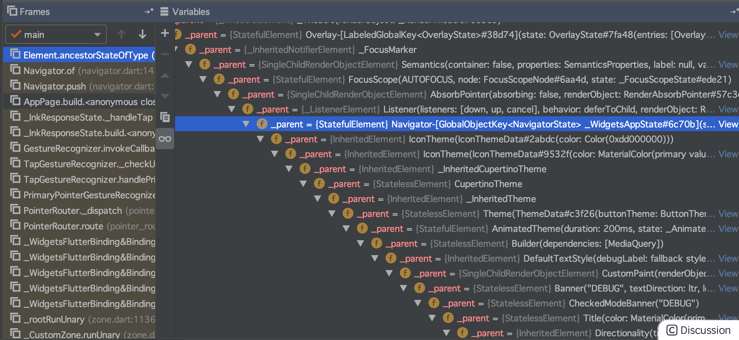 那我们就找找看,为什么navigator会为空。继续往上看,navigator是由context执行不同的方法返回的。由于我们并没有主动赋值rootNavigator,因此navigator是由context执行ancestorStateOfType方法返回的。