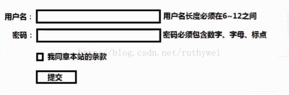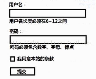 <form class="form-horizontal" action=""> <div class="form-group"> <div class="col-md-1"> <label for="uname" class="control-label">用户名:</label> </div> <div class="col-md-5"> <input id="uname" class="form-control" type="text"> </div> <div class="col-md-3"> <span class="help-block">用户名长度在6~12之间</span> </div> </div> <div class="form-group"> <div class="col-md-1"> <label class="control-label" for="uname">密码:</label> </div> <div class="col-md-5"> <input id="uname" class="form-control" type="text"> </div> <div class="col-md-3"> <span class="help-block">密码中必须包含数字,字母</span> </div> </div> <div class="row"> <div class="col-md-6 col-md-offset-3"> <div class="checkbox"> <label> <input type="checkbox">我接受本站的使用条款 </label> </div> </div> </div> <div class="row"> <div class="col-md-6 col-md-offset-3"> <input class="btn btn-warning" type="button" value="提交"> <input class="btn btn-primary" type="button" value="清空"> </div> </div> </form>