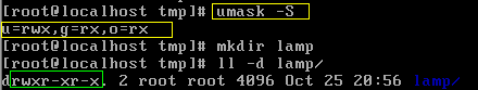 然后,再新建一个目录,看看默认的权限,就变成了刚才设置的rwxr-xr--: