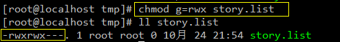 我们可以不去考虑某个用户(ugoa)之前是什么权限,直接用等号给其赋予某个权限(r/w/x)。例如:对所属组(g)设置(=)读写执行权限(rwx):
