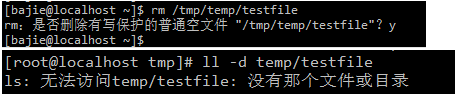 此时testfile 文件的权限是:rw-r--r-- ,那么刚才创建的普通用户bajie 能否删除这个文件呢?