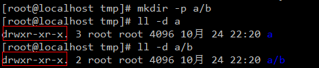 在/tmp 目录下创建a目录,在a目录下创建b目录,查看两个目录的权限。