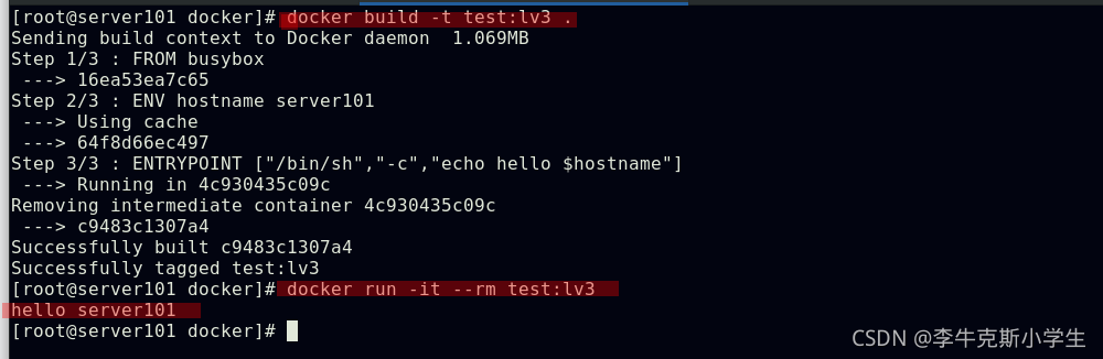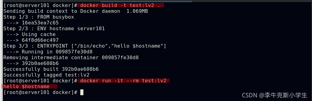 ##可以看到在构建test:lv2镜像时的第2、3步使用了test:lv1镜像的缓存,镜像ID能够一一对应